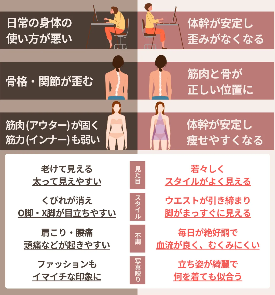 といった悩みは、年齢や生活のせいではなく、身体の使い方・自律神経・ホルモンバランスなど、姿勢の乱れによって“美しさの土台”が乱れていることが原因です。