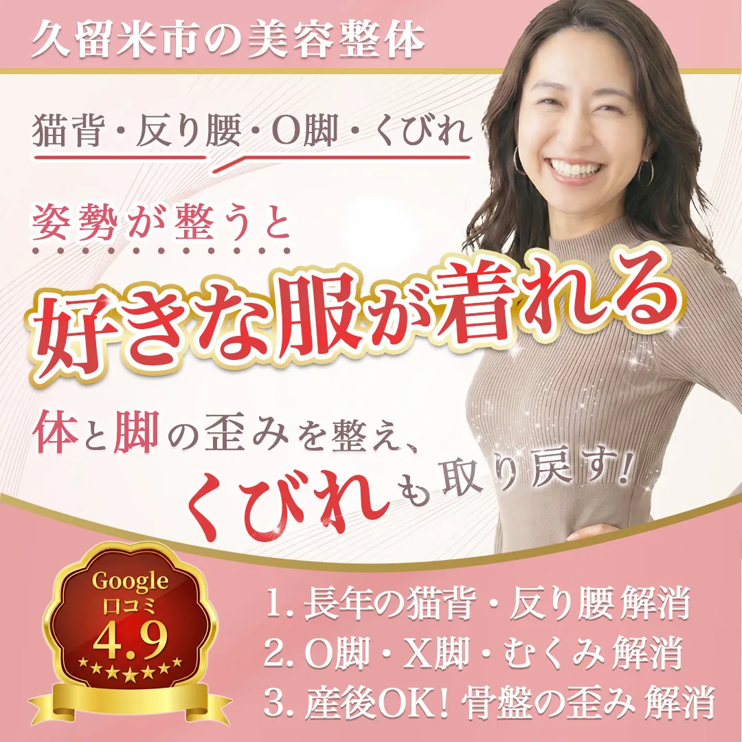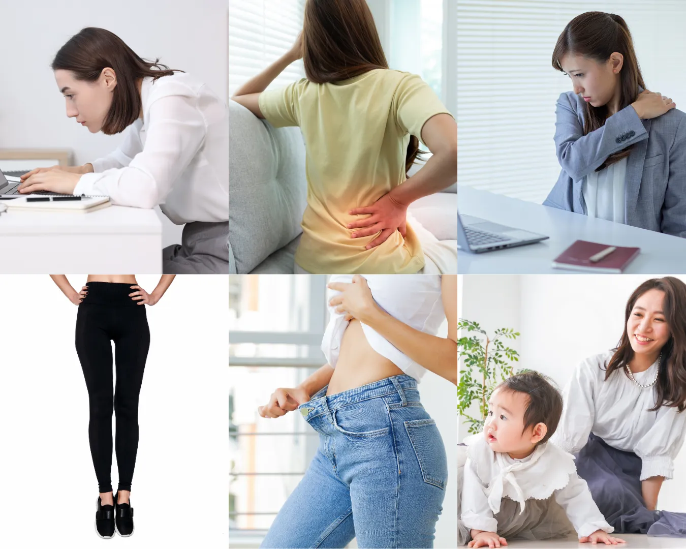 当院では、猫背/反り腰/O脚/X脚/足痩せ/くびれ/産後の骨盤矯正といったオール美容整体で施術を行うため、一度で複数の悩みを同時に解消することが可能です。