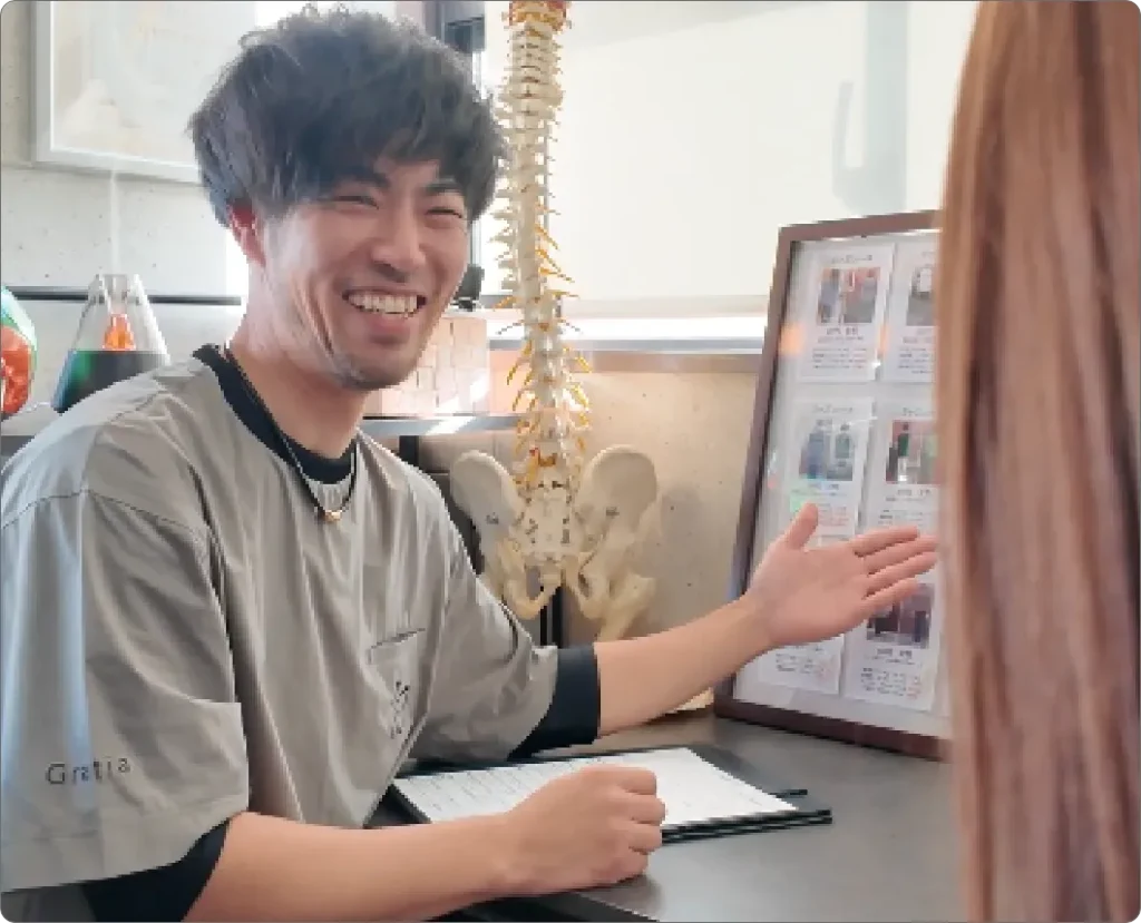 初回カウンセリングでは、現在のお悩みや今後のなりたい理想の姿を聞いていきます。痛みや姿勢、生活スタイルなど、気になることも丁寧にチェックしていきます。気軽になんでもご相談ください!